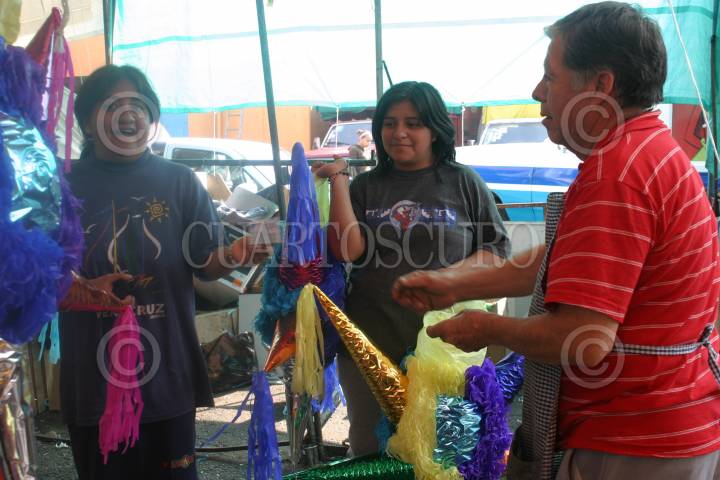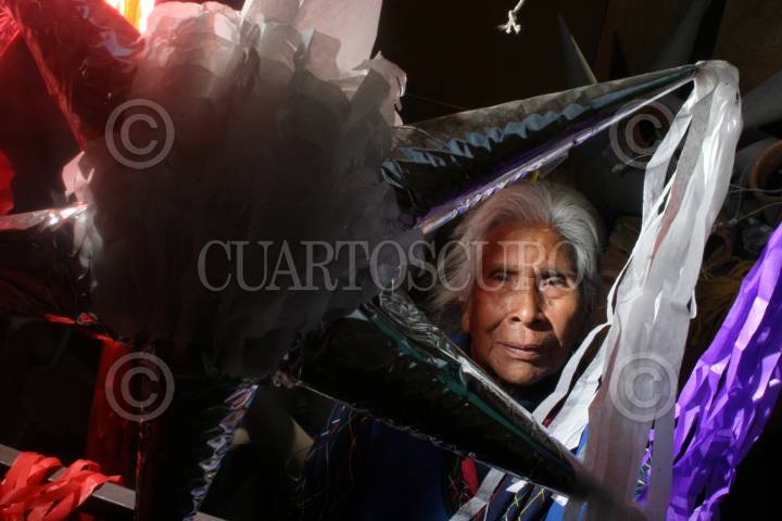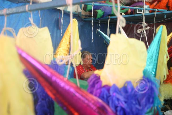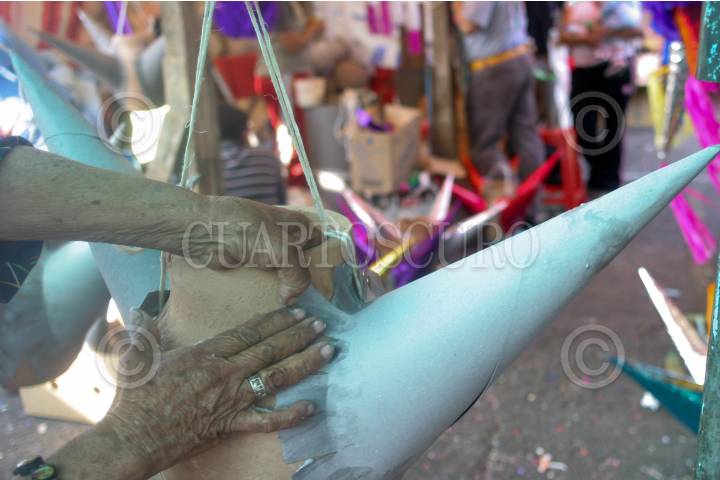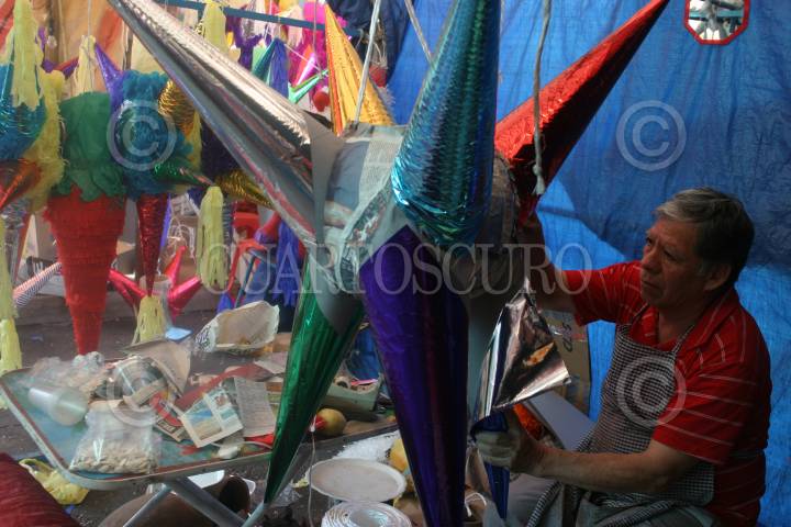 MÉXICO D.F., 22DICIEMBRE2008.- Comerciantes elaboran piñatas a base de ollas de barro, engrudo y papeles de colores, para estas fiestas navideñas el simbolismo que existe detrás de las piñatas también es variado hay quien sostiene que cada uno de los picos representa uno de los siete pecados capitales los cuales deben ser vencidos por medio de la fé y al quebrar la piñata se obtienen dulces y frutas como símbolo de la recompensa divina. El contenido de una piñata suele ser frutas de temporada como cacahuates, jícamas, naranjas, limas, tejocotes, cañas y dulces. FOTO: SÁSHENKA GUTIÉRREZ/CUARTOSCURO.COM