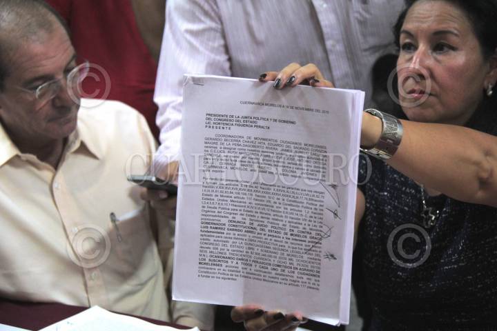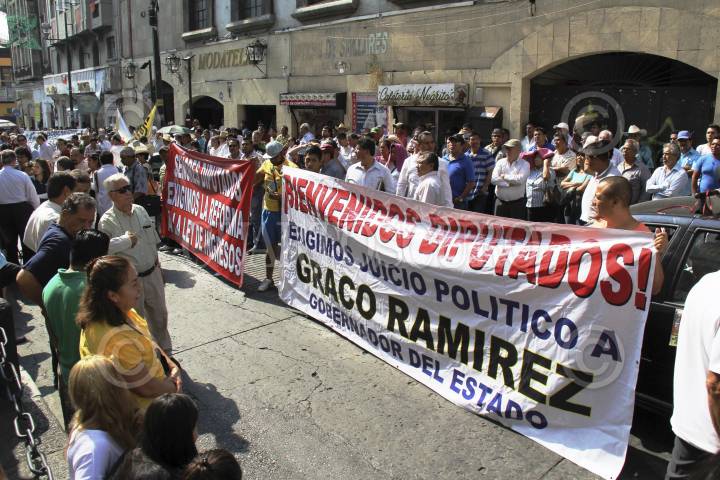 CUERNAVACA, MORELOS, 18NOVIEMBRE2015.- Cientos de personas marcharon desde la Iglesia del Calvario deteniéndose en el Congreso del Estado donde integrantes de la Coordinadora Morelense de Movimientos Ciudadanos entregaron una solicitud de juicio político al gobernador Graco Ramírez, por peculado y desvío de recursos por más de mil ochocientos millones de pesos. FOTO: PATRICIA MORALES / CUARTOSCURO.COM
