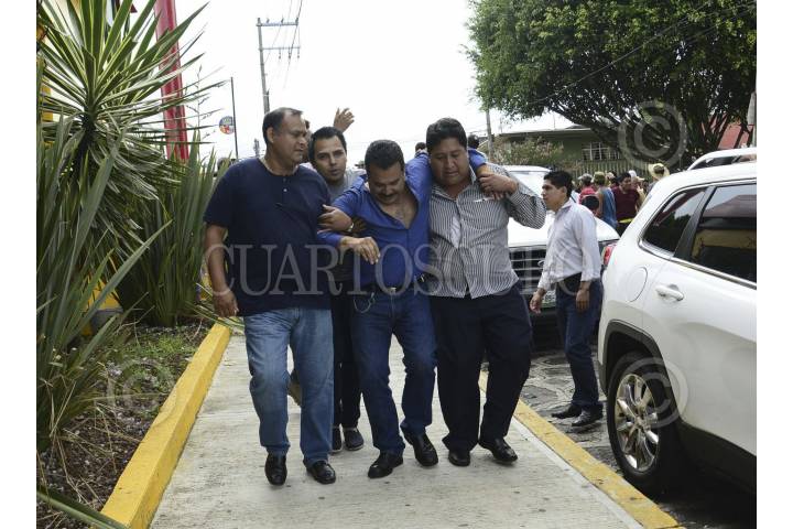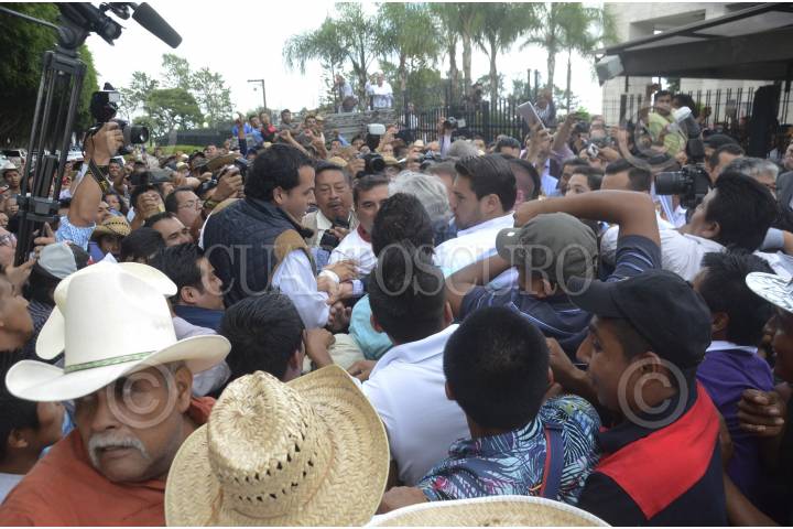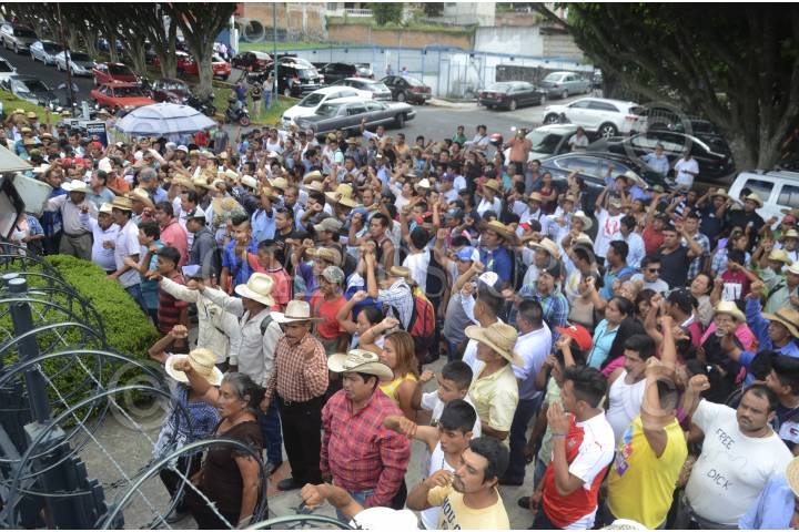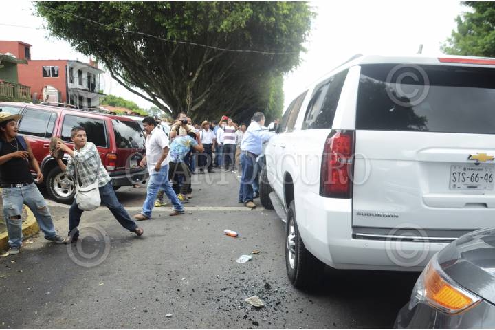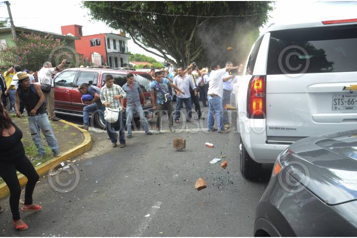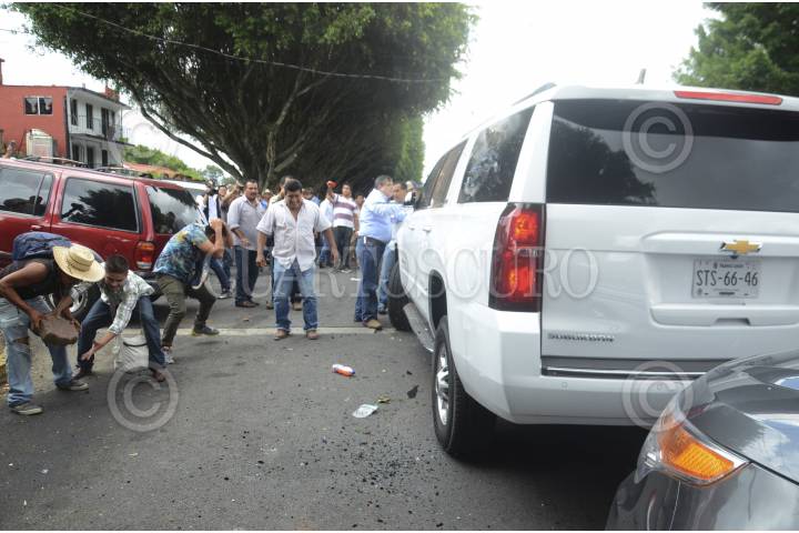 XALAPA, VERACRUZ, 29JUNIO2016.- Integrantes de los 400 pueblos protestaron afuera del congreso local donde se encontraba el dirigente nacional del PAN, Ricardo Anaya; el gobernador electo Miguel Ángel Yunes, y Santiago Creel, quienes al salir del recinto fueron agredidos con piedras y palos, las camionetas en las que se transportaban fueron apedreadas y uno de sus elementos de seguridad resulto herido. FOTO: ALBERTO ROA /CUARTOCURO.COM