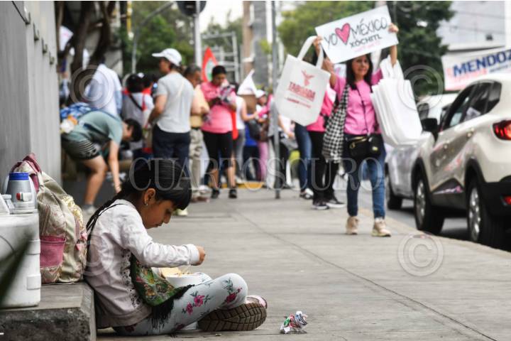 CIUDAD DE MÉXICO, 26ABRIL2024.- Una niña hija de una mujer limpiavidrios degusta un alimento mientras simpatizantes de Xóchitl Gálvez, candidata a la Presidencia de la República por la Coalición Fuerza y Corazón por México, regalan bolsas a favor de Santiago Taboada, y microperforados en el cruce de las avenidas Universidad y Río Churubusco. FOTO: MARIO JASSO/CUARTOSCURO.COM