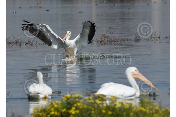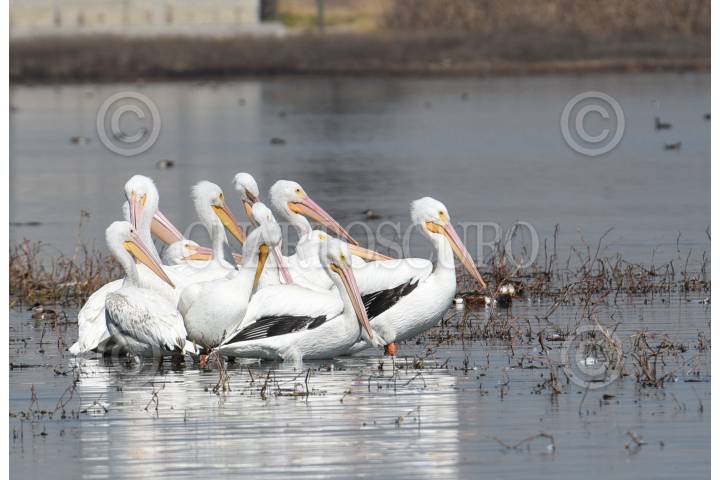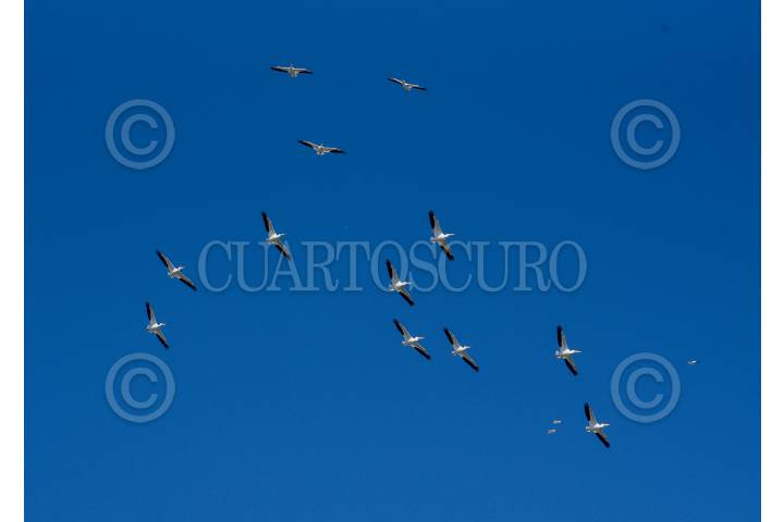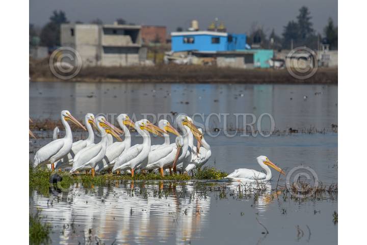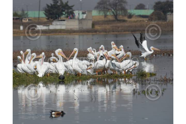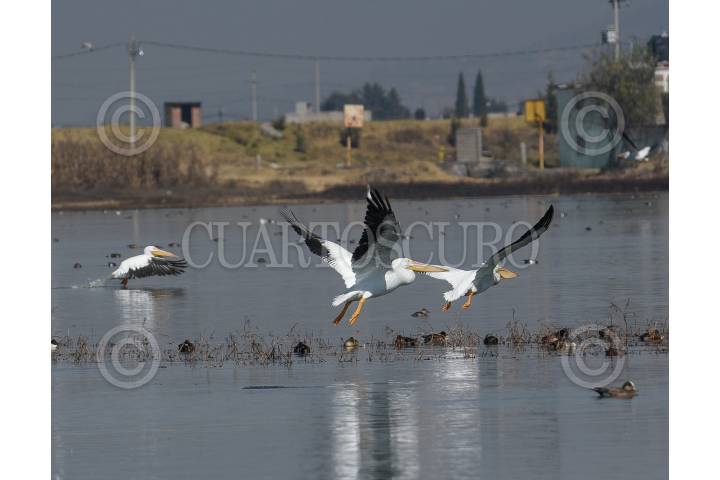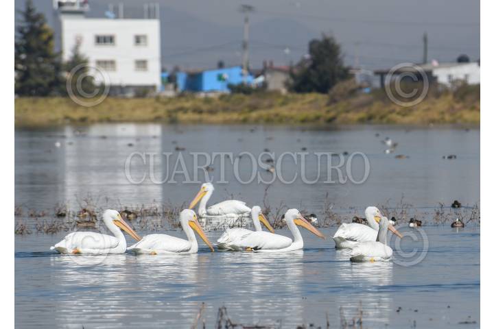 Una parvada de pelícanos blancos americanos se encuentra pasando el invierno en el bordo de San Jerónimo en la delegación toluqueña de Tlachaloya Primera Sección.