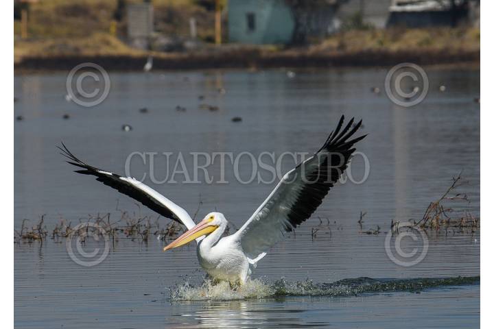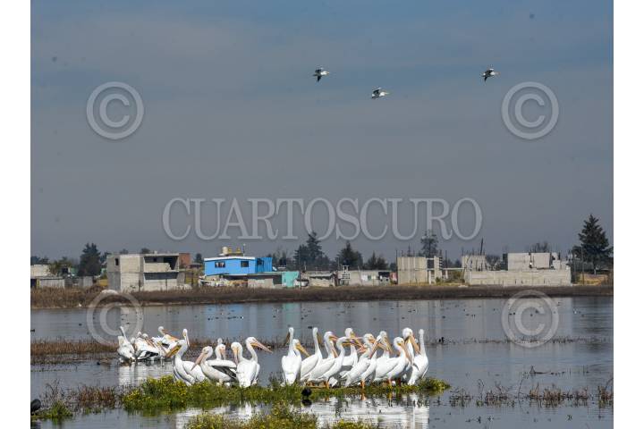 Un grupo de pelícanos blanco americano se encuentra en la laguna de Palmillas en San Pablo Autopán, delegación de Toluca, por segundo año estas aves migraron a cuerpos de agua del Valle de Toluca.