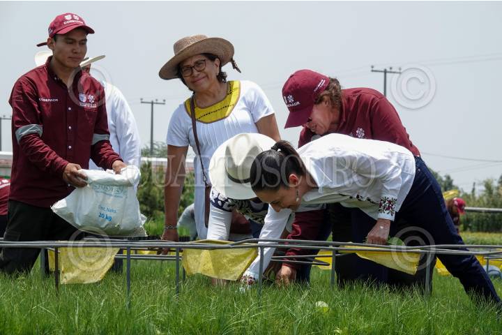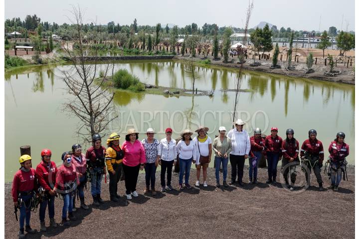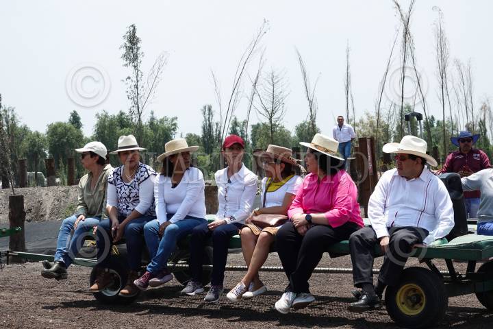 Claudia Sheinbaum; Columba López; Berenice Hernández y José Carlos Acosta durante el recorrido por los trabajos de CODENADR en el Vivero Forestal y Humedal de San Luis Tlaxialtemalco en Xochimilco.