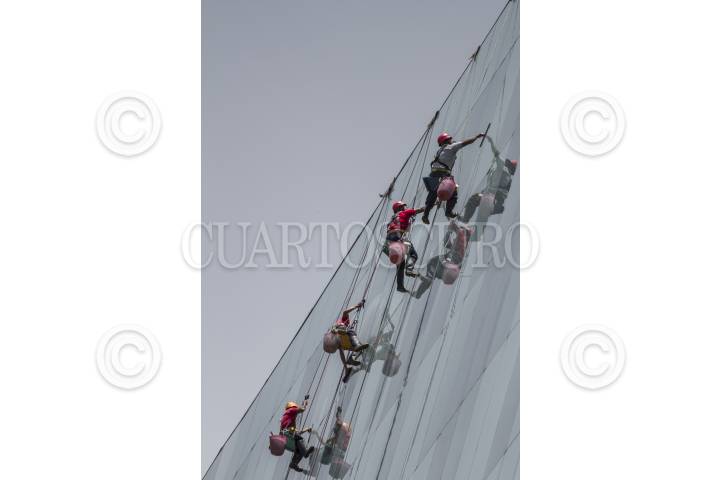 MÉXICO, D.F. 28ENERO2012.- Trabajadores limpian los vidrios del Centro Bursátil que se encuentra en la sede de la Bolsa Mexicana de Valores, ubicada en Paseo de la Reforma. FOTO: MOISÉS PABLO/CUARTOSCURO.COM