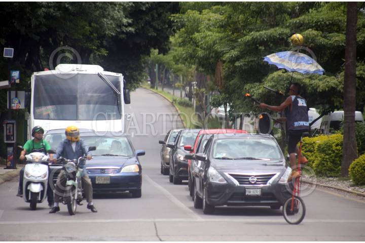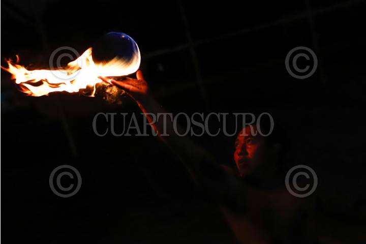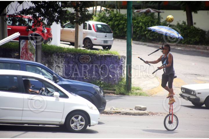 CUERNAVACA, MORELOS, 12AGOSTO2019. Un joven en monociclo hace malabares con tres teas de fuego, y equilibra con la boca un paraguas sobre el cual hay un balón girando. La escena en el crucero de la avenida Vicente Guerrero en la capital del estado. FOTO: MARGARITO PÉREZ RETANA /CUARTOSCURO.COM