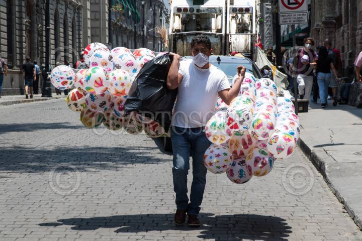 Un comerciantes lleva sobre el hombre decenas de pelotas en una calurosa tarde en el Centro Histórico.