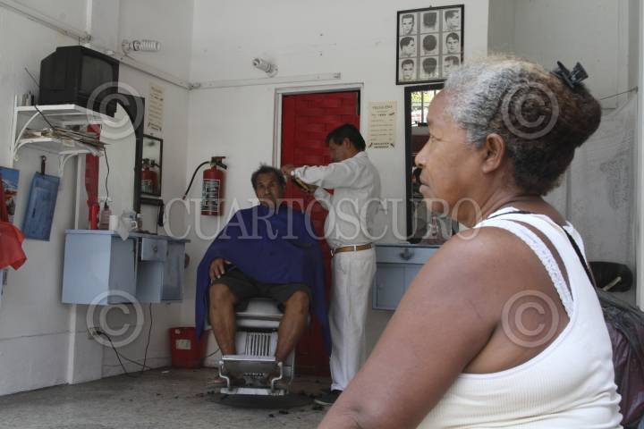ACAPULCO, GUERRERO, 06SEPTIEMBRE2016.- En la calle Válázquez de León, en el Centro, donde el sonido de los taxis colectivos de las diversas rutas de Acapulco, resuenan el claxon y el grito para advertir a los pasajeros su presencia, se encuentra el dueño de la peluquería "Mi Chiquita", Esteban Liborio Jiménez, quien emigro de su pueblo ya que es procedente de un pueblo de Ometepec y que relata que su padre lo indujo para decidirse por el oficio de las tijeras. "Recuerdo muy bien, cuando mi padre me platicó que si quería tener suerte con las mujeres, debería contar con un oficio, porque él lamentaba que una dama, de la que se enamoró profundamente, lo rechazara por ser un simple campesino, por lo que al ver las peluquerías en el puerto, comencé a aprender de los grandes y me inicié en esta bella carrera", dijo Liborio, como lo conocen sus amigo en el lugar. FOTO: BERNANDINO HERNÁNDEZ /CUARTOSCURO.COM