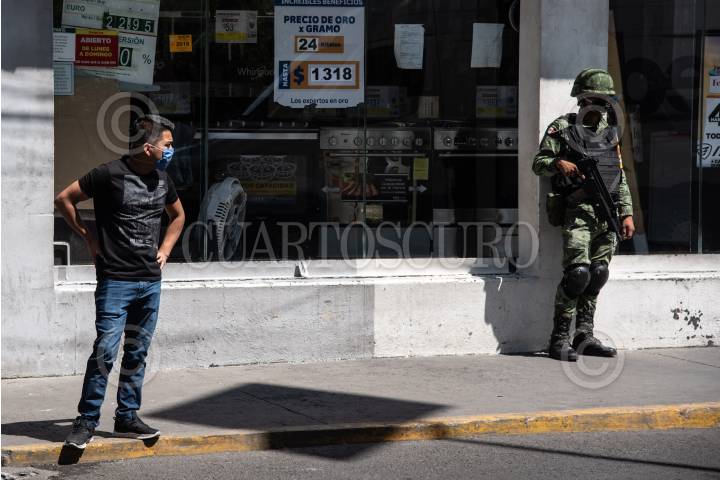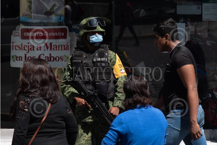 Elementos de la Secretaría de la Defensa Nacional a través del Plan DNIII, continúan reforzando la seguridad en tiendas comerciales de la entidad, como prevención de saqueos mientras permanece la fase 2 de alerta sanitaria por coronavirus (Covid-19).