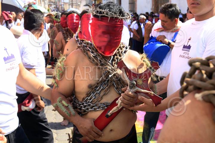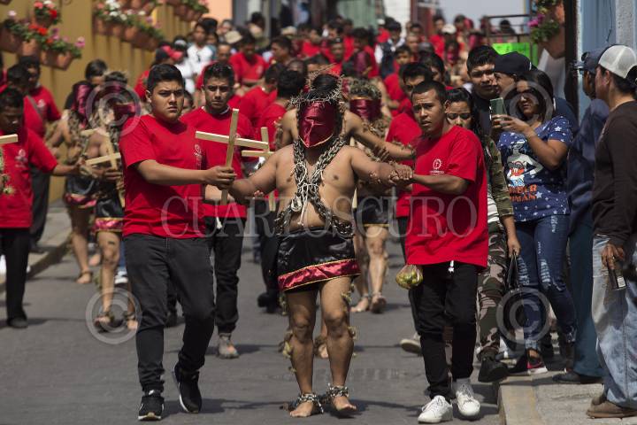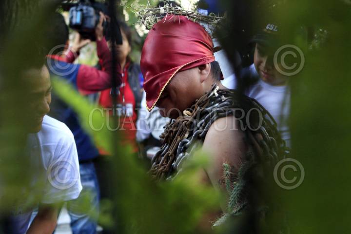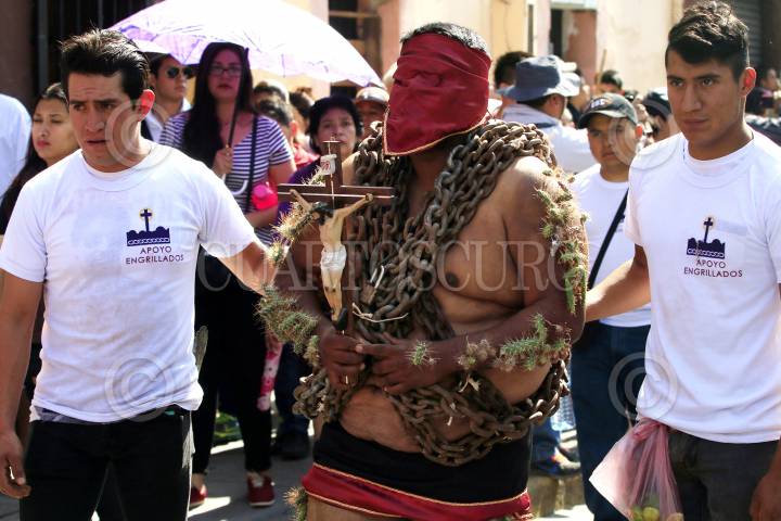 PUEBLA, PUEBLA, 30MARZO2018.- Como cada viernes santo, se realizó la procesión de "Engrillados" del municipio de Atlixco, en el cual mas de cien penitentes participaron cargando pesadas cadenas y espinas en su cuerpo, recorrieron más de 2 kilómetros desde su salida de la capilla de la Tercera Orden hasta llegar al templo de San Francisco, como parte de las tradiciones religiosas de esta semana santa. FOTO: HILDA RÍOS /CUARTOSCURO.COM