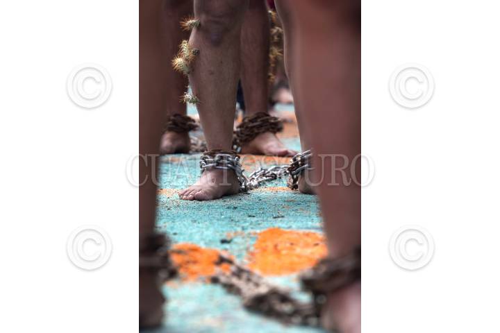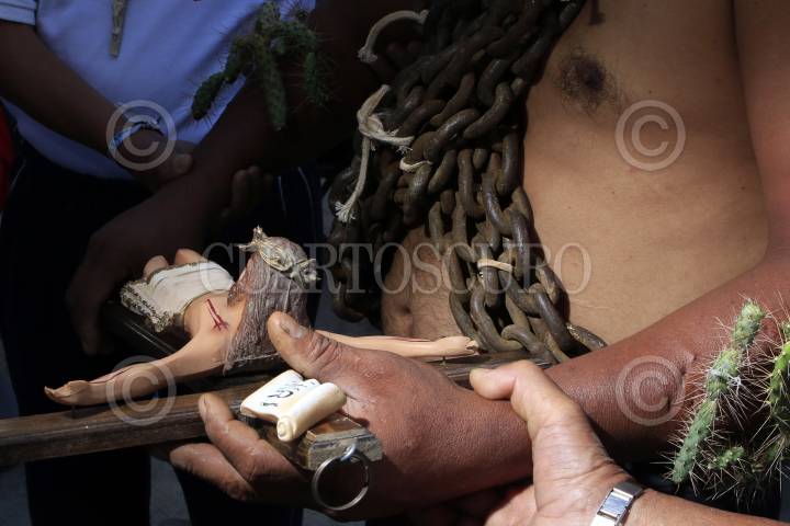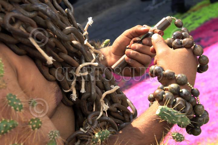 Un penitente recorre las calles de Huaquechula con grilletes en los pies y arrastrando de 50 a 80 kilos de cadenas de hierro como pago de manda, o por alguna gracia recibida.