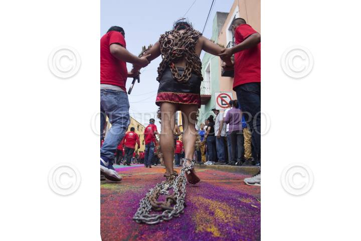 ATLIXCO, PUEBLA; 14ABRIL2017.- Como cada viernes santo, se realizó la procesión de "Engrillados" del municipio de Atlixco, en el cual mas de cien penitentes participaron cargando pesadas cadenas y espinas en su cuerpo, recorrieron más de 2 kilómetros desde su salida de la capilla de la Tercera Orden hasta llegar al templo de San Francisco, como parte de las tradiciones religiosas de esta semana santa. FOTO: HILDA RÍOS/ CUARTOSCURO.COM