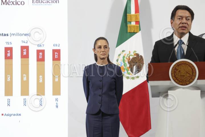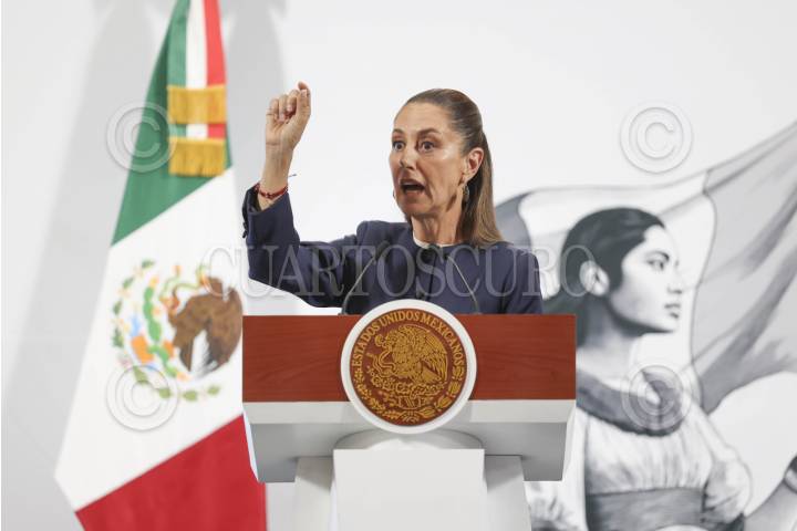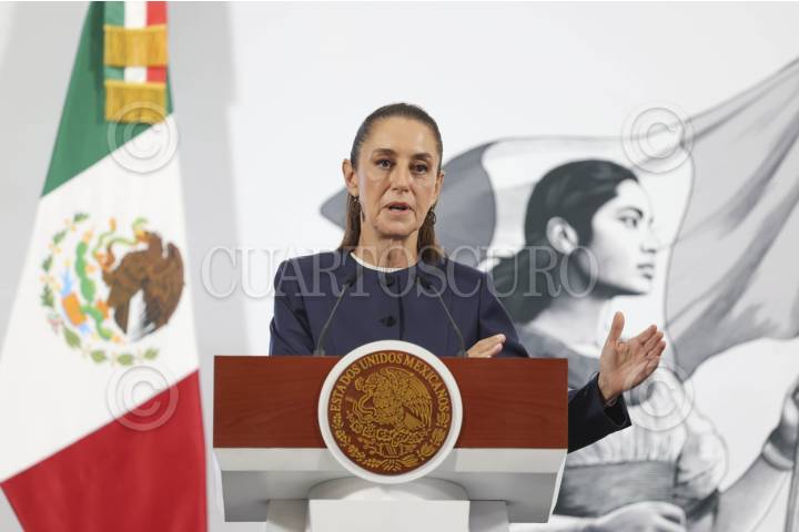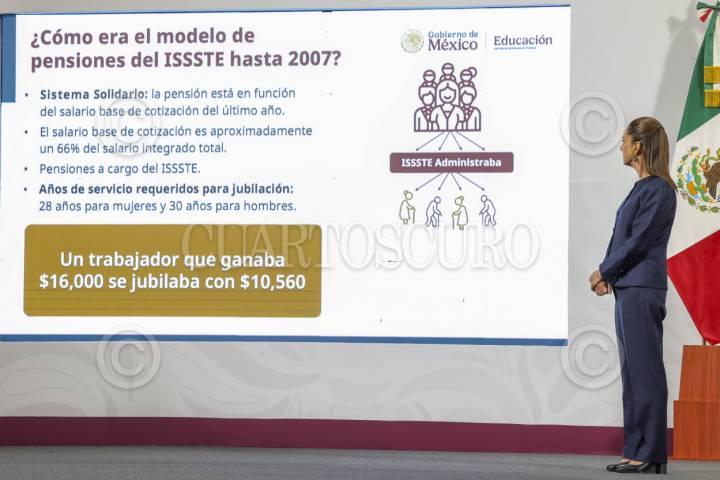 CIUDAD DE MÉXICO, 26MAYO2025.- Claudia Sheinbaum, Presidenta de México, encabezó la Mañanera del Pueblo, en la cual inicio el tema de las pensiones del magisterio nacional, esto en el marco del paro que mantiene la CNTE en las inmediaciones del Zocalo, quienes exigen la abrogacion de la Ley del ISSSTE del 2007. Ahí aseguraron que muchos maestros recibieran la Pensión del Bienestar lo que complementara sus pensiones actuales. FOTO: MOISÉS PABLO/CUARTOSCURO.COM