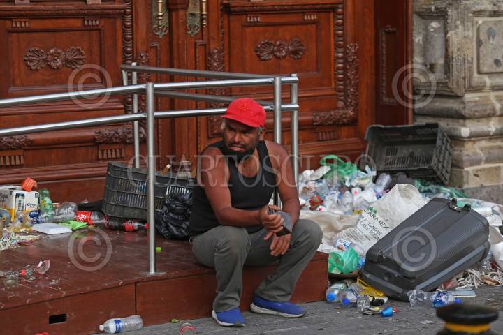 Un pepenador observa los desechos que se tiraron a las afueras de la puerta principal de Palacio de Gobierno, esto durante la protesta que realizaron pepenadores de algunos basureros que tienen inconsistencias y fueron cerrados por el gobierno del estado.