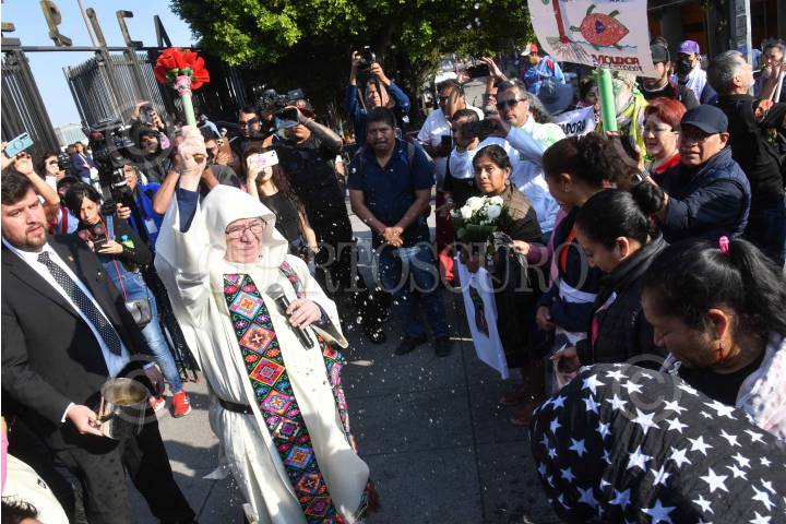 CIUDAD DE MÉXICO, 26DICIEMBRE2024.- Madres y padres de los 43 normalistas desaparecidos de Ayotzinapa, junto a estudiantes, realizaron una marcha que partió de la glorieta de Peralvillo rumbo a la Basílica de Guadalupe, como parte de la actividades de la "123 Acción global por Ayotzinapa" en conmemoración del décimo aniversario de los hechos en Iguala, Guerrero. En la imagen, el obispo Fray Gonzalo Ituarte, bendice a los familiares durante su llegada al recinto mariano. FOTO: MARIO JASSO/CUARTOSCURO.COM