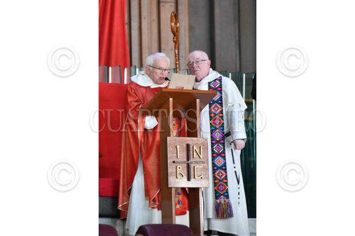 CIUDAD DE MÉXICO, 26DICIEMBRE2024.- Madres y padres de los 43 normalistas desaparecidos de Ayotzinapa, junto a estudiantes, realizaron una marcha que partió de la glorieta de Peralvillo rumbo a la Basílica de Guadalupe, como parte de la actividades de la "123 Acción global por Ayotzinapa" en conmemoración del décimo aniversario de los hechos en Iguala, Guerrero. En la imagen, los obispos Raúl Olvera, y Fray Gonzalo Ituarte, durante la misa ofrecida a las 16 horas. FOTO: MARIO JASSO/CUARTOSCURO.COM