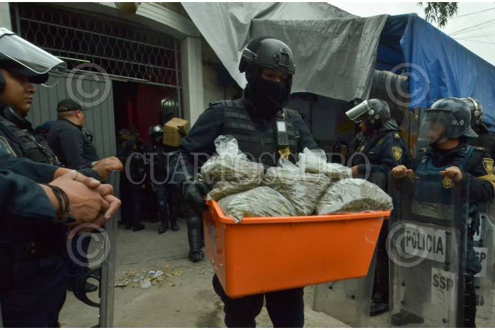 CIUDAD DE MÉXICO, 22OCTUBRE2019.- Elementos de la Secretaría de Seguridad Ciudadana, de la Policía de Investigación así como equipos especial, en conjunto con elementos de la Marina realizaron un operativo contra el narcomenudeo en el predio Peralvillo 33, en la alcaldía de Cuauhtémoc. El lugar fue identificado como uno de los máximos centros de operaciones de la Unión Tepito, a su vez fueron incautados alrededor de dos toneladas de mariguana, armas, material para la elaboración de droga sintética, así como la detención de 31 personas, 26 hombres y 5 mujeres. Durante la revisión se catearon al menos cuatro departamentos en donde había un laboratorio para la elaboración de droga sintética, los cuales estaban interconectados con túneles. FOTO: ARMANDO MONROY /CUARTOSCURO.COM