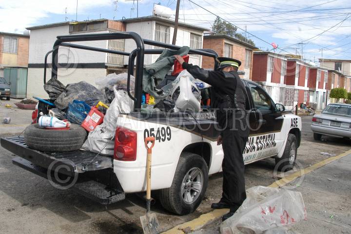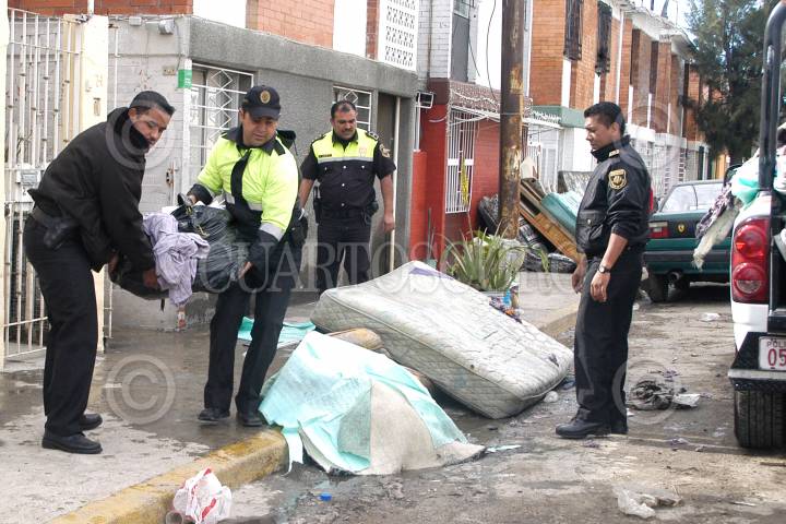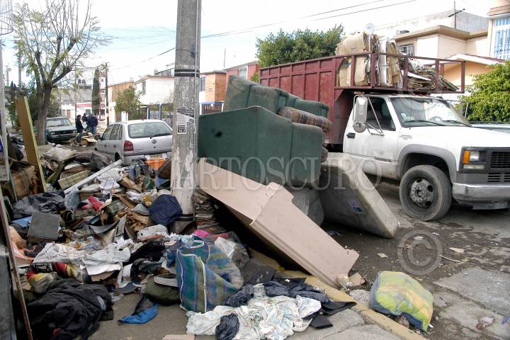 ECATEPEC. ESTADO DE MÉXICO, 08FEBRERO2010.- Continúan las labores de limpieza en las colonias que se vieron afectadas por las inundaciones de la semana pasada en el Municipio de Ecatepec. La mayoría de las familias tuvieron que deshacerse de sus muebles que se echaron a perder por las aguas negras. Elementos de la policía Estatal ayudan a recabar toda esta basura y ayudan en las labores de limpieza. FOTO: LUIS CARBAYO/CUARTOSCURO.COM