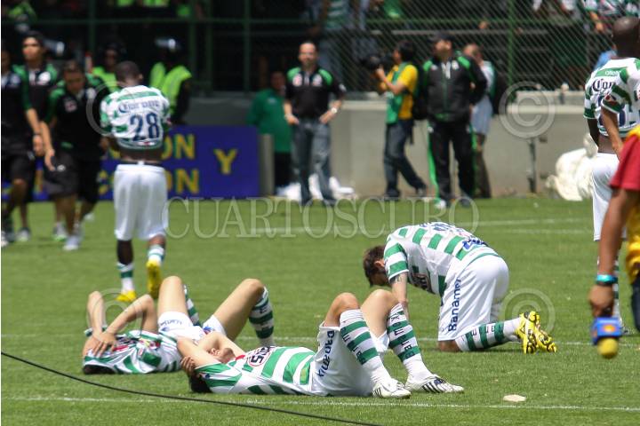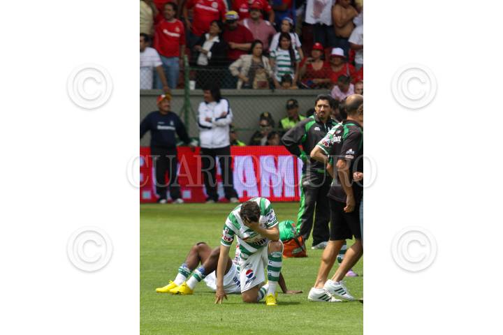TOLUCA, ESTADO DE MÉXICO, 23MAYO2010.- Jugadores de los Santos Laguna se lamentan luego de perder en ronda de penales la final del torneo Bicentenario en contra de los Diablos del Toluca que se realizo en el Estadio Nemesio Diez, ganando los Diablos 4 goles a 3 en tiros de penal. FOTO: RODOLFO ANGULO/CUARTOSCURO.COM