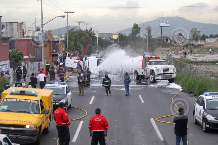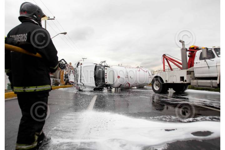 MÉXICO, D.F., 18JUNIO2010.- Una Pipa transportadora de Gas L. P. Con placas de circulación KU-15-409 de la empresa Energas, volcó al perder el control al circular sobre la avenida Rió de Los Remedios a la altura de la colonia Valle de Aragón por lo que elementos del cuerpo de Bomberos acudieron para evitar un accidente mayor. FOTO: LUIS CARBAYO/CUARTOSCURO.COM
