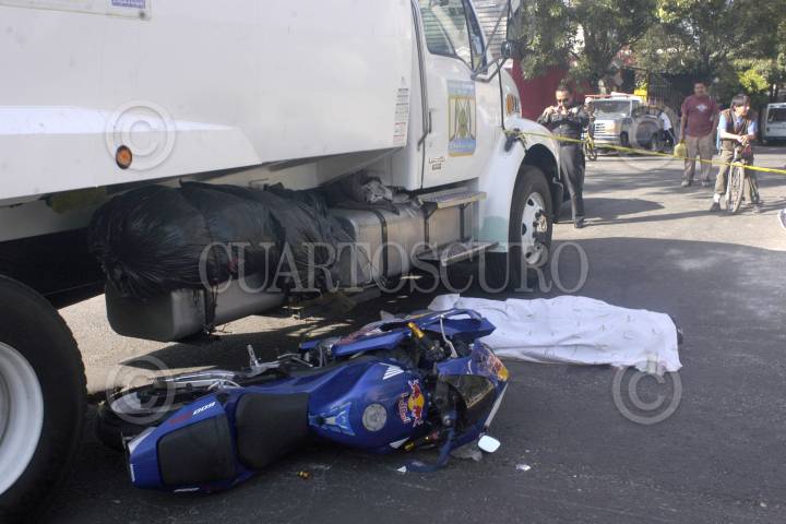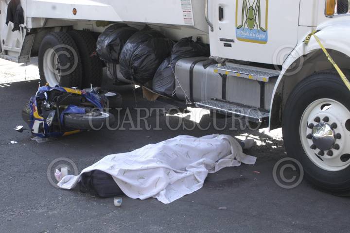 MÉXICO, D.F., 22ENERO2011.- Un sujeto de aproximadamente 40 años pierde la vida al derrapar e impactar con su motocicleta contra un camión recolector de basura al perder el control de la unidad en las calles Antonio Valeriano y cerrada de Naranjo en la colonia Del Gas perímetro de la delegación Azcapotzalco. FOTO: LUIS CARBAYO/CUARTOSCURO.COM