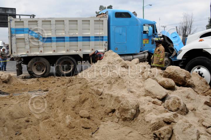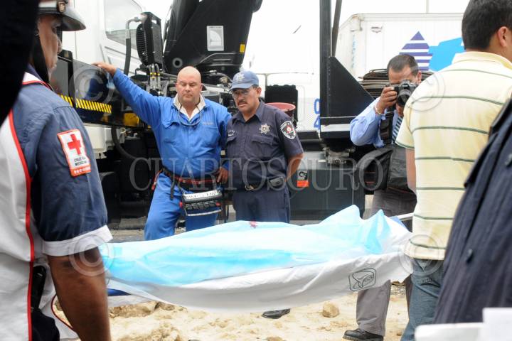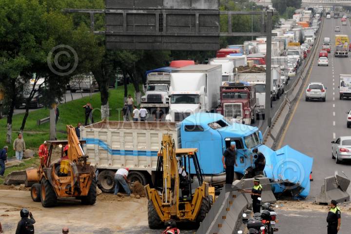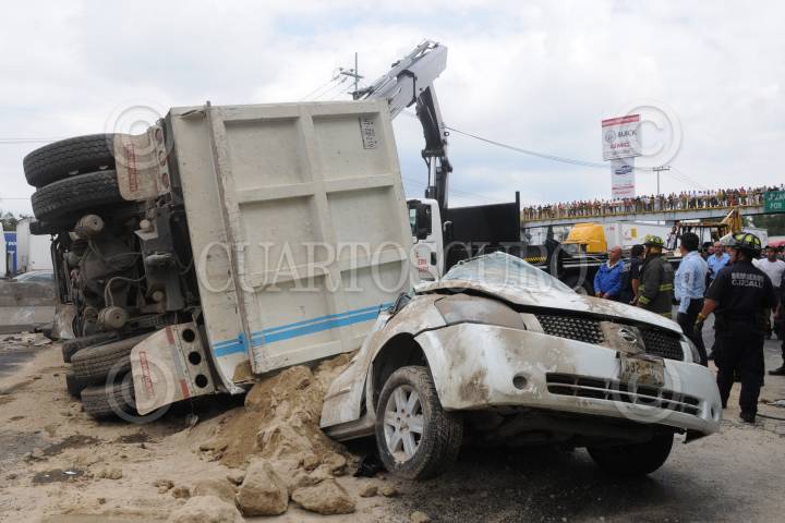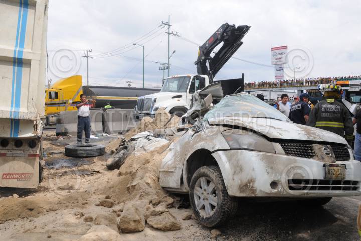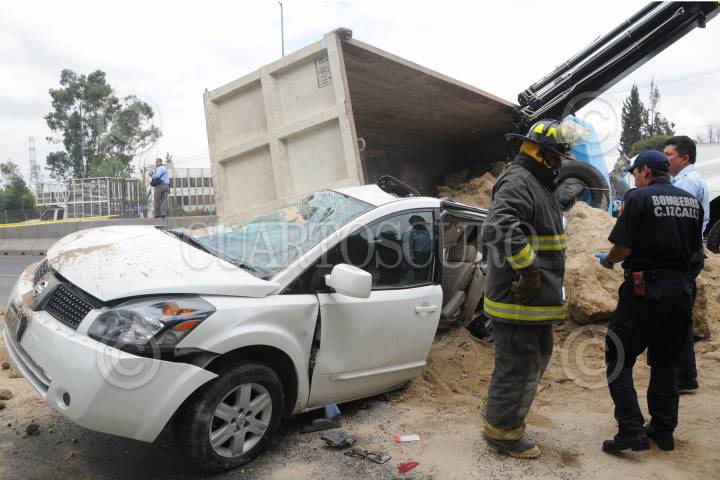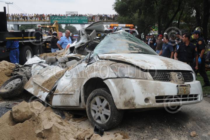 CUAUTITLAN IZCALLI, ESTADO DE MÉXICO, 26AGOSTO2010.- Dos pequeñas de 3 y 4 años, pierden la vida cuando viajaban en compañia de su madre a bordo del auto Nissan Cuest de color arena placas 832-SDL, sobre la autopista, México - Querétaro a la altura de la colonia Arcos del Alba en Cuautitlan Izcalli kilómetro 33 +500. Un camión de volteo perdio el control por el exceso de velocidad cayendo encima del auto aplastando a este y a sus ocupantes. FOTO: LUIS CARBAYO/CUARTOSCURO.COM