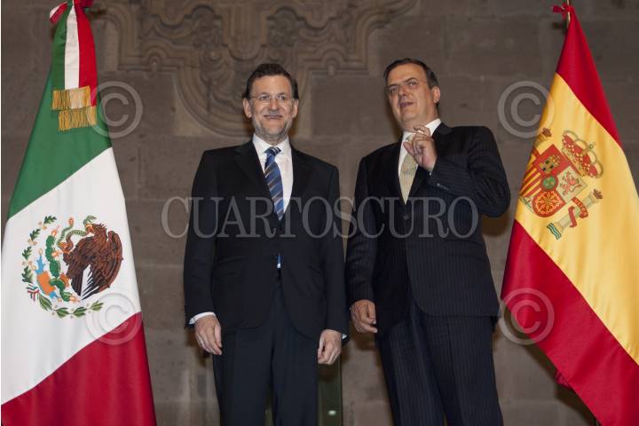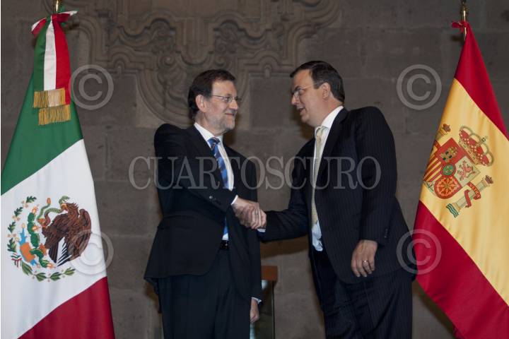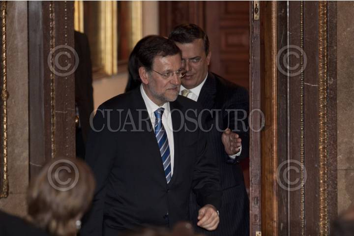 MÉXICO, D.F., 18ABRIL2012.- Mariano Rajoy Brey, presidente del gobierno Español y Marcelo Ebrard, jefe de gobierno del Distrito Federal durante la ceremonia de entrega de la Llave de la Ciudad y Pergamino durante un acto en el Salón de los Cabildos del Antiguo Palacio del Ayuntamiento. FOTO: RODOLFO ANGULO /CUARTOSCURO.COM