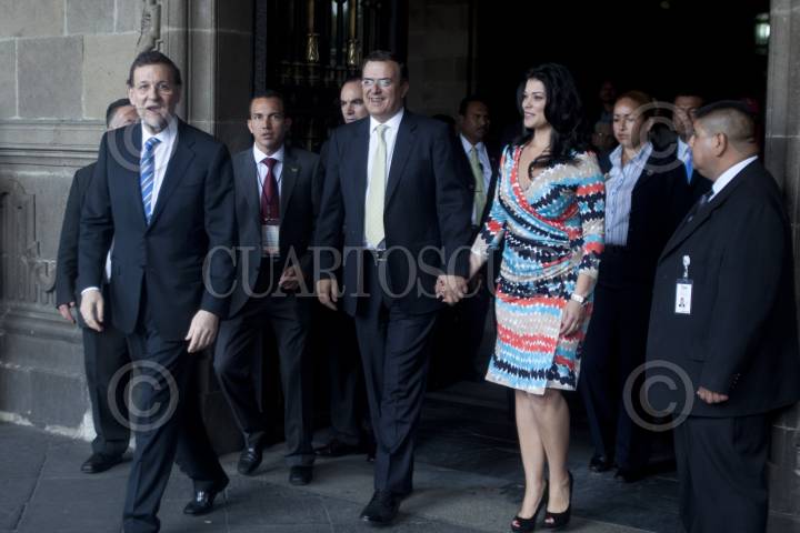 MÉXICO, D.F., 18ABRIL2012.- Mariano Rajoy Brey, presidente del gobierno Español y Marcelo Ebrard, jefe de gobierno del Distrito Federal acompañado de su esposa Rosalinda Bueso, al termino de la ceremonia de entrega de la Llave de la Ciudad y Pergamino durante un acto en el Salón de los Cabildos del Antiguo Palacio del Ayuntamiento. FOTO: RODOLFO ANGULO /CUARTOSCURO.COM