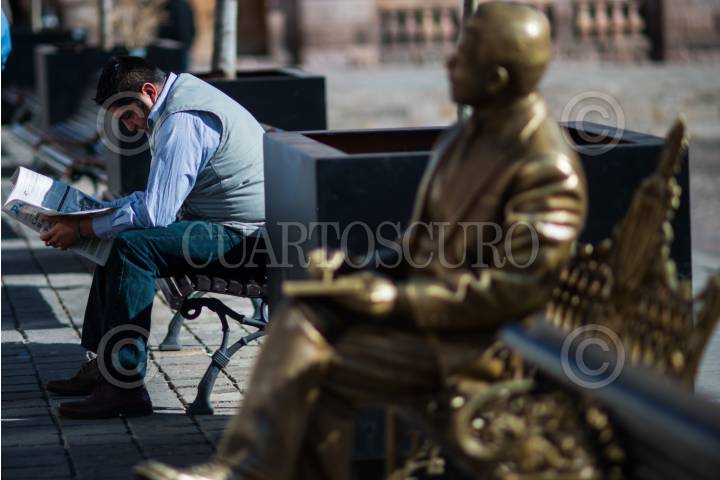 ZACATECAS, ZACATECAS, 17ENERO2018.- Un hombre lee el periódico mientras que en primer plano una escultura del poeta zacatecano Ramón López Velarde vigila la lectura mañanera. FOTO: MISAEL VALTIERRA / CUARTOSCURO.COM