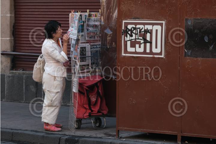 CIUDAD DE MÉXICO, 13AGOSTO2019.- Una señora lee los periódicos de un puesto que se encuentra en el Centro Histórico. FOTO: GRACIELA LÓPEZ /CUARTOSCURO.COM