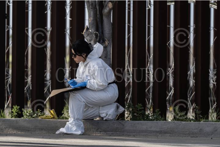 TIJUANA, BAJA CALIFORNIA, 06ENERO2024.- Minutos antes del medio día de este sábado, un agente de la policía municipal de la unidad de inteligencia, fue atacado por disparos de arma de fuego. Según información extraoficial, el policía estaba abordo de una camioneta Tacoma color gris, acompañado de una agente cuando fueron envestidos por unos sujetos que comenzaron a dispararle. Los responsables dispararon desde un vehículo tipo Kia, Sorento, mismo en el que trataron de huir en dirección ascendente sobre la avenida Jhonson, sin embargo uno de los responsables perdió la vida. El oficial de la policía municipal, fue trasladado abordo de la misma Tacoma hacia las instalaciones del Isstecali en el Mirador en estado crítico. Una cámara de vigilancia logró captar el exacto del ataque, donde se puede observar a la agente disparando hacia los agresores en varias ocasiones. Una gran cantidad de casquillos percutidos quedaron en la escena donde se registraron los hechos en la avenida Jhonson de la colonia Cañón Jhonson de acuerdo a los señalamientos de Servicios Periciales. La imagen muestra a personal de Servicios periciales realizando la investigación correspondiente. FOTO: OMAR MARTÍNEZ /CUARTOSCURO.COM