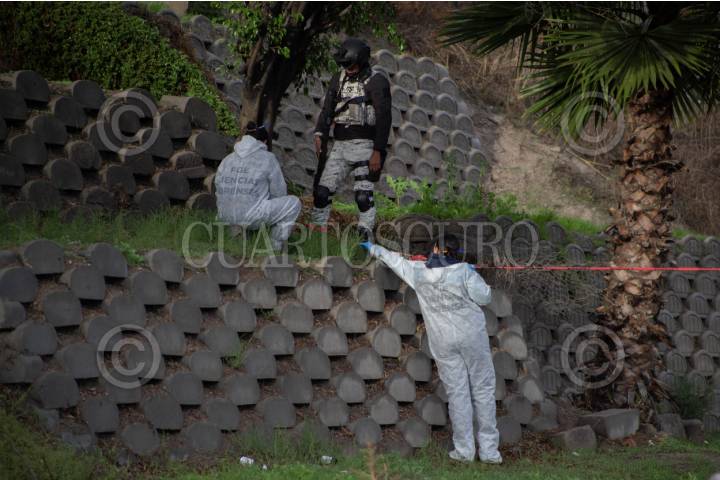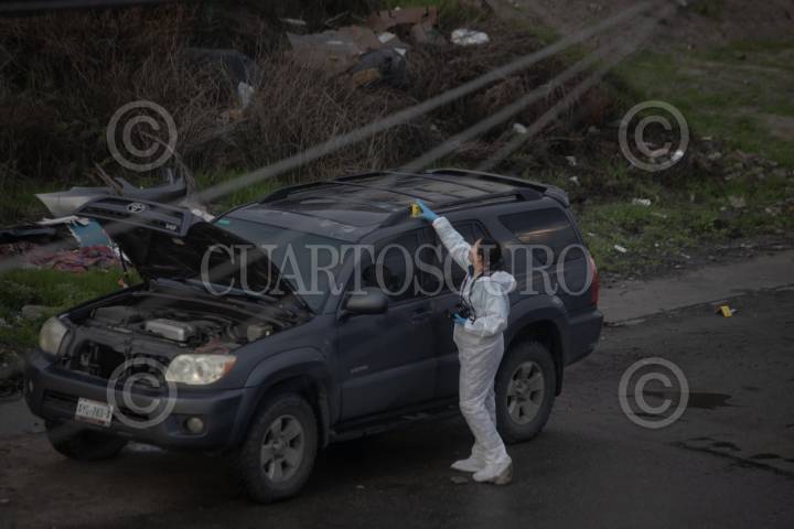 TIJUANA, BAJA CALIFORNIA, 06ENERO2024.- Minutos antes del medio día de este sábado, un agente de la policía municipal de la unidad de inteligencia, fue atacado por disparos de arma de fuego. Según información extraoficial, el policía estaba abordo de una camioneta Tacoma color gris, acompañado de una agente cuando fueron envestidos por unos sujetos que comenzaron a dispararle. Los responsables dispararon desde un vehículo tipo Kia, Sorento, mismo en el que trataron de huir en dirección ascendente sobre la avenida Jhonson, sin embargo uno de los responsables perdió la vida. El oficial de la policía municipal, fue trasladado abordo de la misma Tacoma hacia las instalaciones del Isstecali en el Mirador en estado crítico. Una cámara de vigilancia logró captar el exacto del ataque, donde se puede observar a la agente disparando hacia los agresores en varias ocasiones. Una gran cantidad de casquillos percutidos quedaron en la escena donde se registraron los hechos en la avenida Jhonson de la colonia Cañón Jhonson de acuerdo a los señalamientos de Servicios Periciales. La imagen muestra a personas de servicios periciales realizando la investigación correspondiente. FOTO: OMAR MARTÍNEZ /CUARTOSCURO.COM
