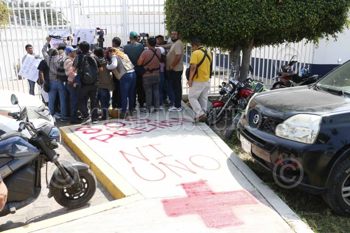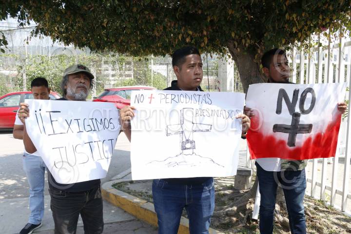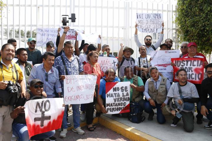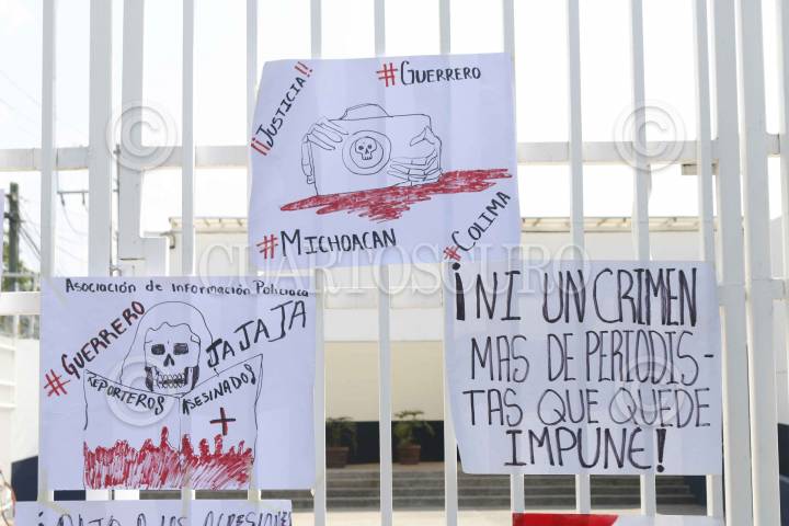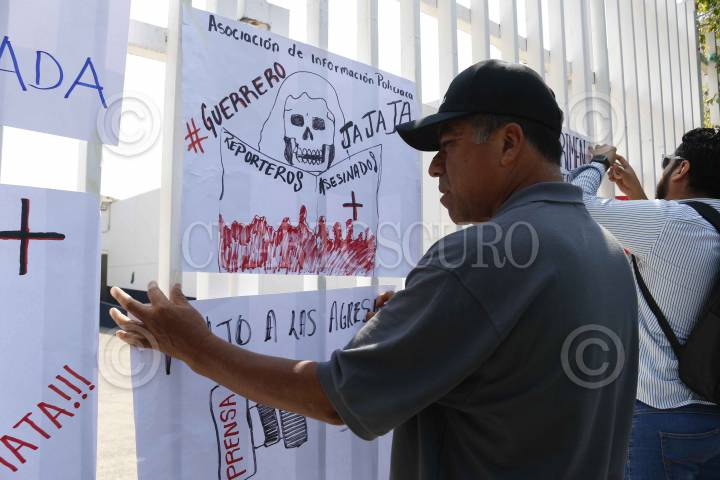 CHILPANCINGO, GUERRERO, 31OCTUBRE2024.- Periodistas de la capital del estado hicieron un mitin afuera de la Fiscalía General de la República (FGR), para exigir justicia por el asesinato de los comunicadores Mauricio Cruz Solís en Michoacán y Patricia Ramírez González, conocida como Paty Bunbury en Colima. Demandaron un alto a las agresiones como el caso de Alberto Toledo Denova, hijo del periodista Marco Antonio Toledo, quien por segunda ocasión fue privado de su libertad y tras nueve horas fue localizado golpeado en el municipio de Taxco de Alarcón. Además de que los dos recientes asesinatos a periodistas deben encender las alarmas y mantener alerta a los periodistas de Guerrero, ya que es una entidad donde la impunidad campea porque desde hace tres sexenios no se ha investigado ningún caso de agresión ni asesinato contra el gremio. Lamentando que en los primeros 30 días del sexenio de la presidenta Claudia Sheinbaum se hayan registrado dos asesinatos y una agresión contra periodistas. FOTO: DASSAEV TÉLLEZ ADAME/CUARTOSCURO.COM