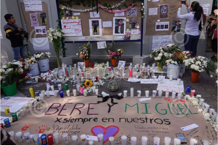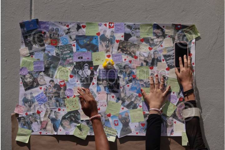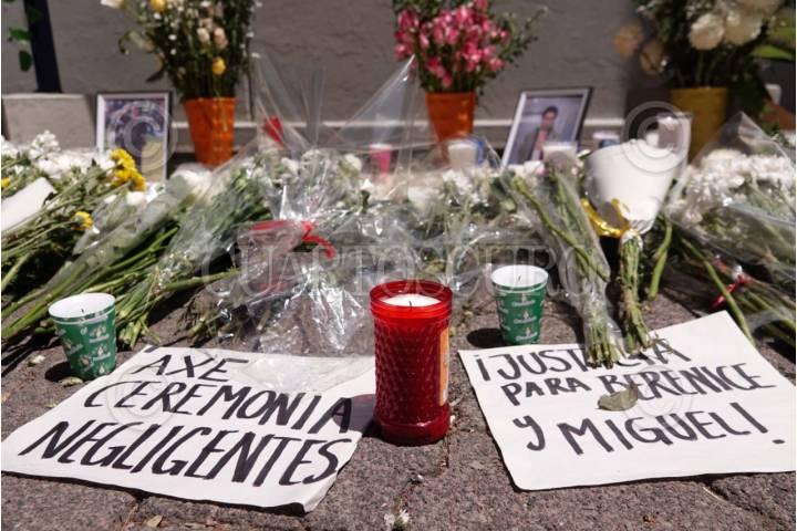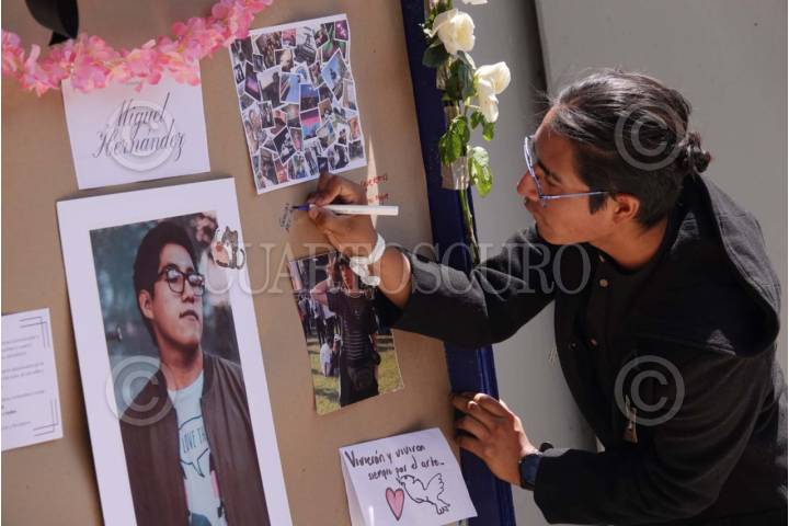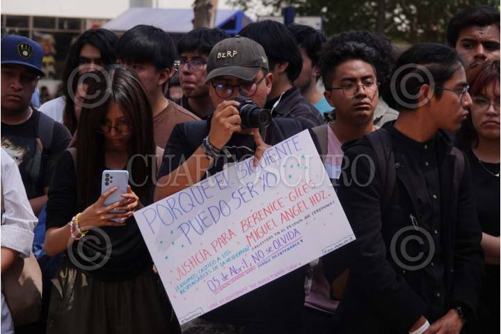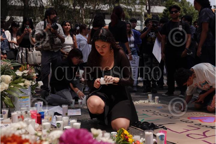 CIUDAD DE MÉXICO, 07ABRIL2025.- Alumnos de la Facultad de Estudios Superiores Acatlán realizaron un homenaje a los fotógrafos y ex alumnos de esta institución Citlalli Berenice Giles Rivera y Miguel Rojas Hernández, quienes perdieron la vida el pasado 5 de abril debido a que se cayó una estructura de una grúa mientras estaban trabajando en el Festival Axel Ceremonia en el Parque Bicentenario. Amigos, compañeros y maestros rindieron palabras en su honor y exigieron justicia a los responsables que se han deslindado de cubrir la indemnización. FOTO: GRACIELA LÓPEZ/CUARTOSCURO.COM