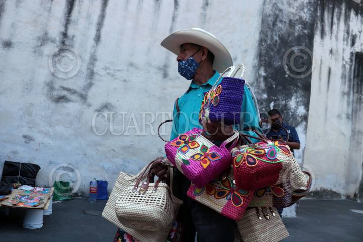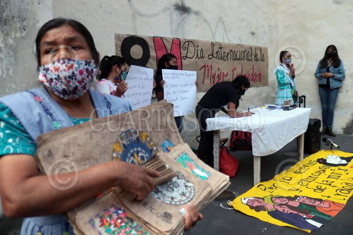 Mujeres indígenas que venden artesanías afuera de la Catedral de la ciudad protestan contra el gobierno municipal, que les persigue y niega su derecho a trabajar.