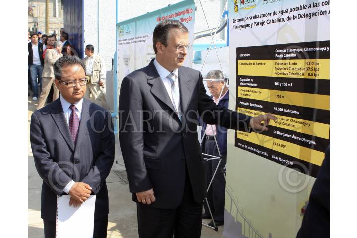 MÉXICO, D.F., 26MAYO2010.- Marcelo Ebrard, jefe de gobierno del Distrito Federal acompañado de Eduardo Santillán, delegado de Alvaro Obregon durante la explicación del sistema que abastecerá de agua potable a las colonias Chamontoya, Tlacoyaque y Paraje Caballito en dicha demarcación pero que no pudo ser inaugurado debido a la falta de energía eléctrica. FOTO: RODOLFO ANGULO/CUARTOSCURO.COM