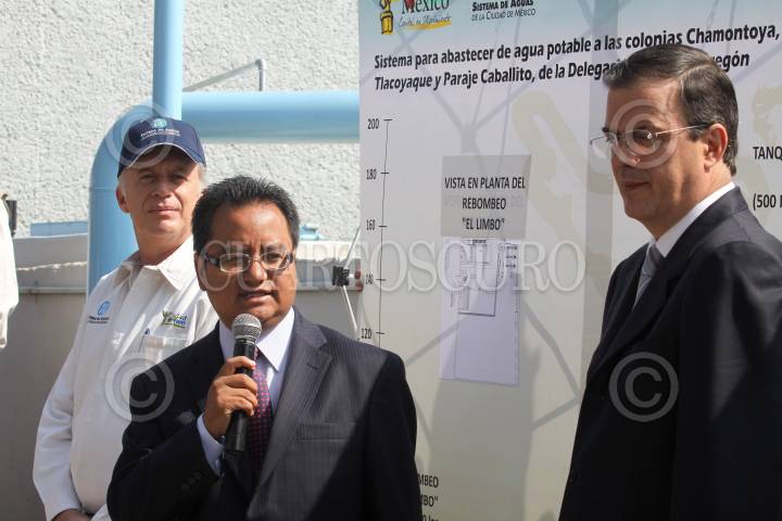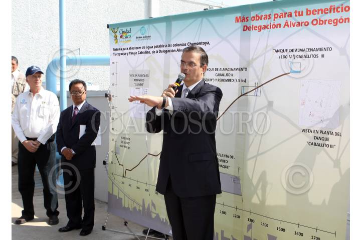 MÉXICO, D.F., 26MAYO2010.- Marcelo Ebrard, jefe de gobierno del Distrito Federal acompañado de Ramon Aguirre, titular del Sistema de Aguas de la Ciudad y de Eduardo Santillán, delegado de Alvaro Obregon durante la explicación del sistema que abastecerá de agua potable a las colonias Chamontoya, Tlacoyaque y Paraje Caballito en dicha demarcación pero que no pudo ser inaugurado debido a la falta de energía eléctrica. FOTO: RODOLFO ANGULO/CUARTOSCURO.COM