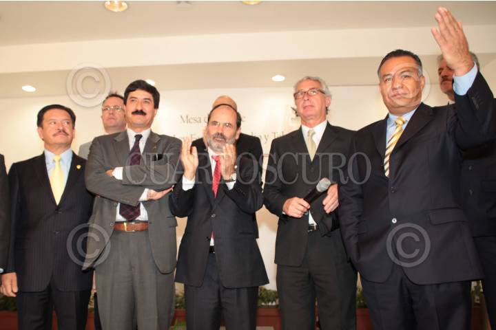 MÉXICO D.F., 14ABRIL2010.- El senador Carlos Navarrete, el diputado Javier Corral, el senador Gustavo Madero, el periodista Javier Solorzono y el senador Carlos Sotelo García despues de posponer un debate que sería hoy, entre el panista Javier Corral y el perredista Carlos Sotelo, sobre la ley de medios en donde se revisarían diversas iniciativas para reformar la Ley Federal de Radio y Televisión, con el objetivo de avanzar hacia una reforma que permita que en México exista un modelo democrático de comunicación desde los medios electrónicos. FOTO: CUARTOSCURO.COM