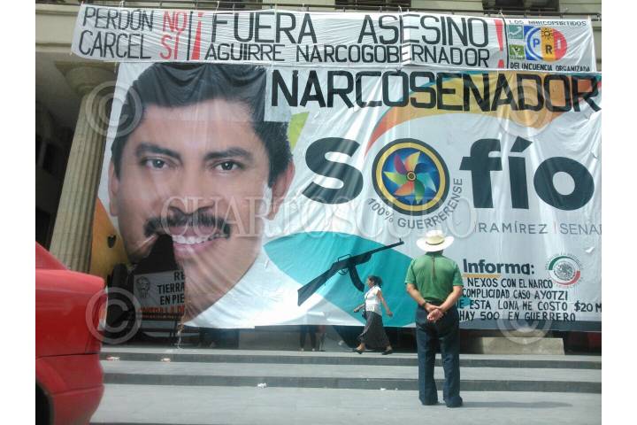 CHILPANCINGO, GUERRERO, 16OCTUBRE2014.- Una manta con una leyenda que acusa de nexos con el narco al senador perredista Sofío Socorro Ramírez se colocó en Chilpancingo, Guerrero. FOTO: JOSE I. HERNANDEZ /CUARTOSCURO.COM