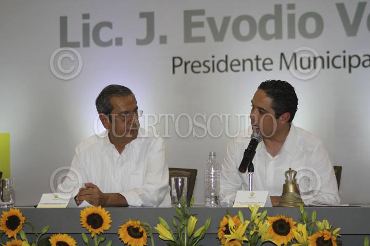 MÉXICO, D.F., 30SEPTIEMBRE2015.- El perredista Evodio Velázquez Aguirre tomó protesta como alcalde de Acapulco en ceremonia efectuada en el Foro Mundo Imperial de la zona Diamante. En la imagen con el gobernador Rogelio Ortega. FOTO: BERNANDINO HERNÁNDEZ /CUARTOSCURO.COM