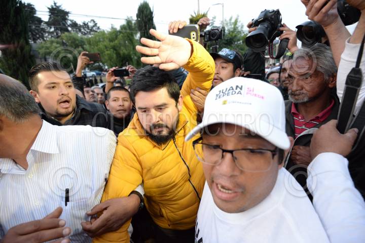 TOLUCA, ESTADO DE MÉXICO, 25ABRIL2017.- Un seguidor del PRD entre empujones y gritos encaró al ex candidato independiente Isidro Pastor Medrano, quien continúa si huelga de hambre a un costado del edificio del IEEM, esto durante el desarrollo del debate entre los candidatos a la gubernatura del Estado de México. FOTO: ARTEMIO GUERRA BAZ /CUARTOSCURO.COM