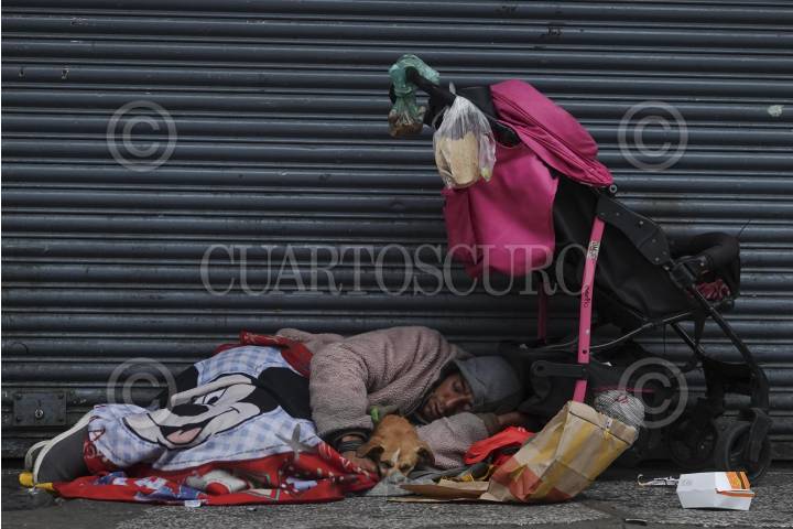 CIUDAD DE MÉXICO, 07OCTUBRE2024.- Entre cobijas y una carreola, un hombre en situación de calle, acompañado de su perro descansa sobre la banqueta de Avenida Eje Central, en el Centro Histórico. FOTO: GRACIELA LÓPEZ/CUARTOSCURO.COM