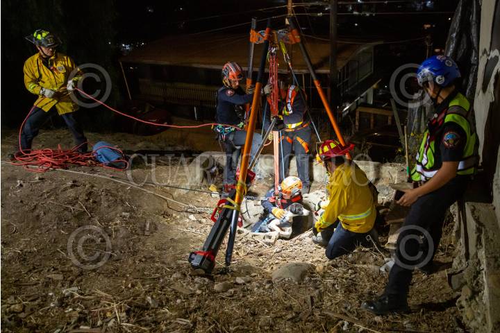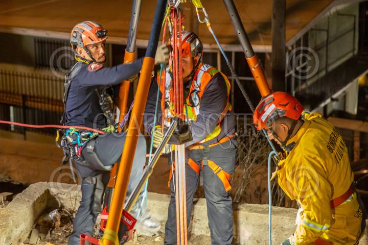TIJUANA BAJA CALIFORNIA, 29OCTUBRE2024.-Bomberos realizando maniobras. Tras trabajar por poco más de dos horas, elementos del cuerpo de bomberos lograron rescatar con éxito a un perro que llevaba atrapado varios días en el fondo de un pozo de alrededor de 20 metros de profundidad. Vecinos de la colonia Obrera fueron quienes, alrededor de las 5:00 de la tarde notificaron a las autoridades que habian escuchado ruidos en un pozo ubicado sobre la calle Pípila y en el fondo había un perro atrapado.A pesar de la poca visibilidad y el poco espacio, alrededor de 13 bomberos y un elemento de Protección Civil, se prepararon con equipo especial para realizar las maniobras de rescate. Gracias al arduo trabajo en equipo de los héroes de la ciudad, lograron sacar sano y salvo al perrito, alrededor de las 7:00 de la noche, el cual salió corriendo desesperadamente tras volver a sentir la libertad.FOTO: CHRIS NOYOLA/CUARTOSCURO.COM