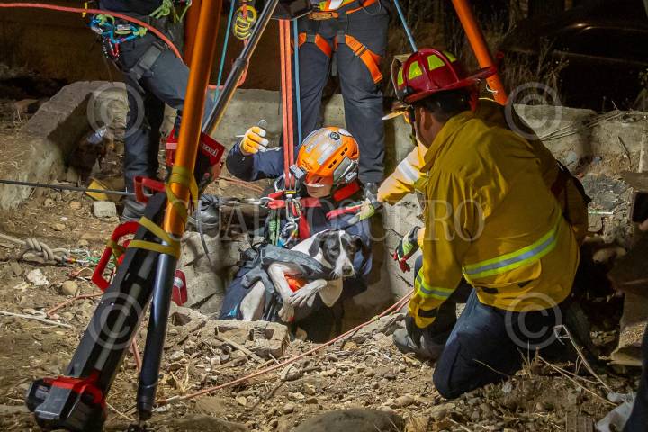 TIJUANA BAJA CALIFORNIA, 29OCTUBRE2024.- Perro siendo rescatado por bomberos. Tras trabajar por poco más de dos horas, elementos del cuerpo de bomberos lograron rescatar con éxito a un perro que llevaba atrapado varios días en el fondo de un pozo de alrededor de 20 metros de profundidad. Vecinos de la colonia Obrera fueron quienes, alrededor de las 5:00 de la tarde notificaron a las autoridades que habian escuchado ruidos en un pozo ubicado sobre la calle Pípila y en el fondo había un perro atrapado.A pesar de la poca visibilidad y el poco espacio, alrededor de 13 bomberos y un elemento de Protección Civil, se prepararon con equipo especial para realizar las maniobras de rescate. Gracias al arduo trabajo en equipo de los héroes de la ciudad, lograron sacar sano y salvo al perrito, alrededor de las 7:00 de la noche, el cual salió corriendo desesperadamente tras volver a sentir la libertad.FOTO: CHRIS NOYOLA/CUARTOSCURO.COM