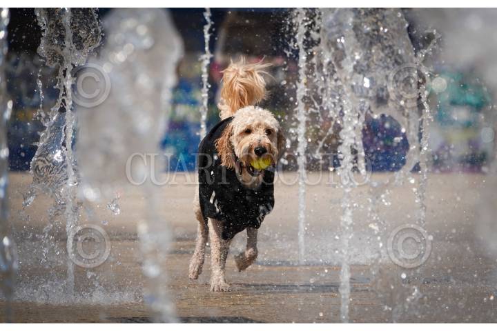 CIUDAD DE MÉXICO, 25ENERO2025.- Un perro corre con una pelota en el hocico en la fuente de la explanada de Monumento de la Revolución. FOTO: MAGDALENA MONTIEL/CUARTOSCURO.COM