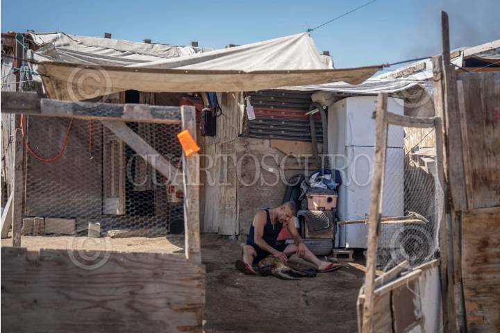 TIJUANA BAJA CALIFORNIA 13JULIO2025.- Hombre acariciando a su perro Lucas luego de que bomberos le brindaran oxigeno tras haber sufrido una insolación por las altas temperaturas.Un incendio en la colonia Terrazas del Valle consumió al menos 15 viviendas, además de vehículos y animales. No hubo heridos graves, aunque un bombero resultó lesionado por la explosión de un neumático. Al lugar acudieron 30 bomberos y seis máquinas para controlar el fuego, que presuntamente inició en la parte alta de la colonia. FOTOS OMAR MARTÍNEZ /CUARTOSCURO.COM
