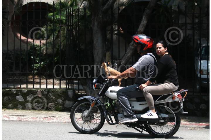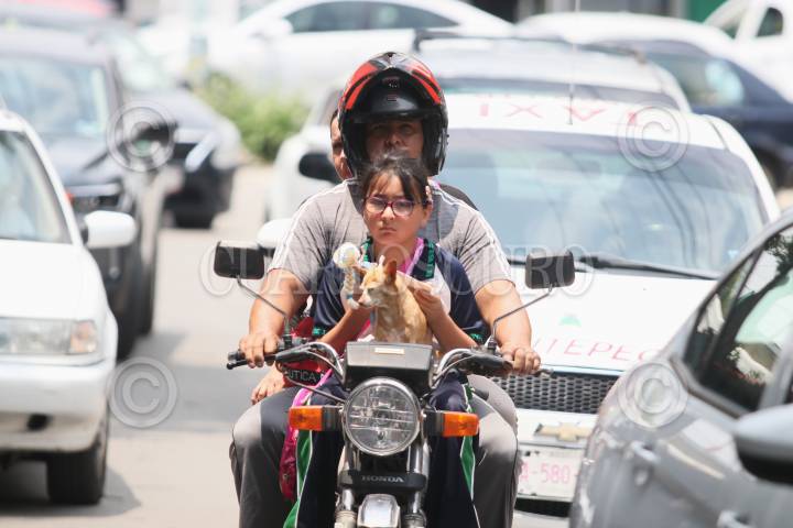 JIUTEPEC, MORELOS, 06SEPTIEMBRE2024.- Ida y vuelta al colegio con mascota. Escena cotidiana en una calle del poblado de Atlacomulco, una pareja va al colegio a recoger a su hija en motocicleta acompañada de su mascota. FOTO: MARGARITO PÉREZ RETANA/CUARTOSCURO.COM