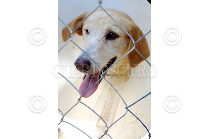 Un perrita mira a través de una de las puertas, ella es la nueva inquilina del refugio de caninos abandonados "La Casa del Mestizo", la pequeña padece de sarna y otras enfermedades.