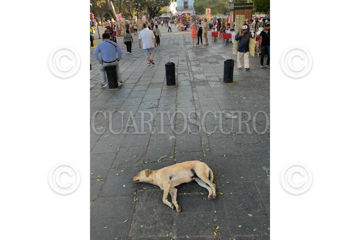 Un perro duerme en el zócalo de Oaxaca, el cual lució lleno de turistas durante el fin de semana largo.