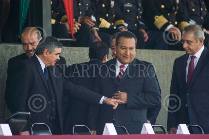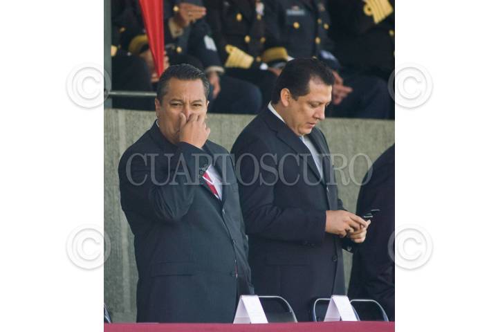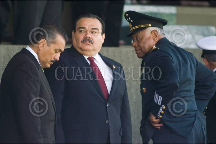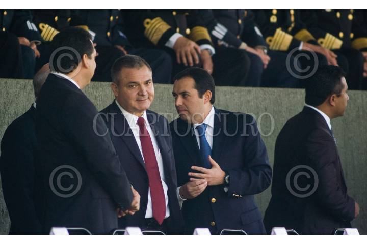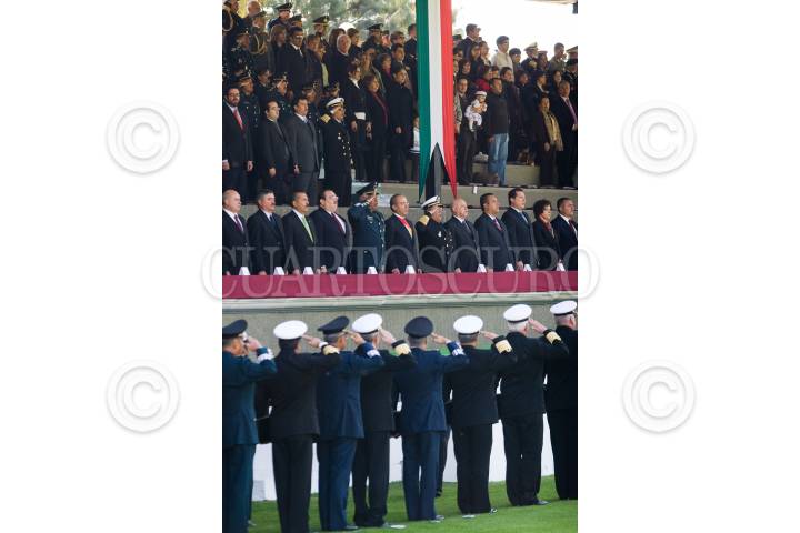 MÉXICO, D.F., 20NOVIEMBRE2009.- Carlos Navarrete, presidente de la mesa directiva de la Cámara de Senadores; Francisco Ramírez Acuña, presidente de la mesa directiva de la Cámara de Diputados; el general Guillermo Galvan, secretario de la Defensa; el presidente Felipe Calderón, el almirante Francisco Saynez, secretario de Marina; Guillermo Ortiz Mayagoitia, ministro presidente de la Suprema Corte y Fernando Gomez - Mont, secretario de Gobernación durante la ceremonia de entrega de condecoraciones de perseverancia, merito deportivo y ascensos de elementos militares que se celebro en el campo militar Marte. FOTO: RODOLFO ANGULO/CUARTOSCURO.COM