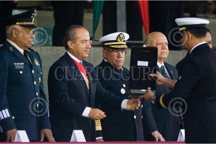 MÉXICO, D.F., 20NOVIEMBRE2009.- El presidente Felipe Calderón acompañado del general Guillermo Galvan, secretario de la Defensa y del almirante Francisco Saynez, secretario de Marina durante la ceremonia de entrega de condecoraciones de perseverancia, merito deportivo y ascensos de elementos militares que se celebro en el campo militar Marte. FOTO: RODOLFO ANGULO/CUARTOSCURO.COM